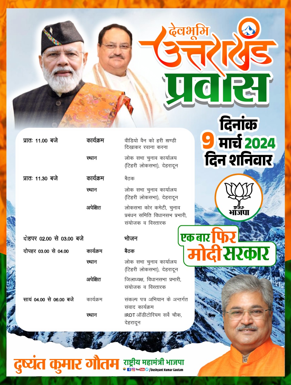 भाजपा प्रदेश चुनाव प्रभारी राष्ट्रीय महामंत्री श्री दुष्यंत कुमार गौतम पार्टी चुनाव अभियान को गति देने के लिए दो दिवसीय प्रवास पर उत्तराखंड पहुंचेंगे