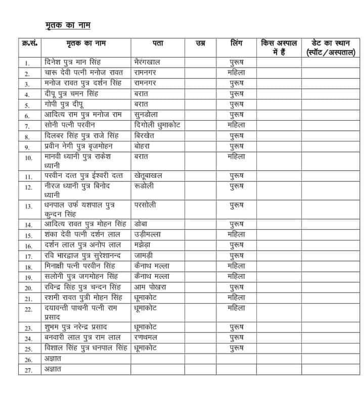 मुख्यमंत्री ने रामनगर चिकित्सालय में भर्ती घायलों का हालचाल जाना तथा उनके बेहतर उपचार हेतु आवश्यक निर्देश सीएमओ व अन्य चिकित्सकों को दिए। उन्होंने कहा कि प्रत्येक घायल व्यक्ति को बेहतर से बेहतर उपचार मिले, अगर उन्हें हायर सेन्टर भेजने की आवश्यकता है तो एयर एंबुलेंस से तत्काल भेजा जाय इस दौरान मुख्यमंत्री घायलों के परिजनों से भी मिले तथा उन्हें घायलों को बेहतर से बेहतर इलाज उपलब्ध कराने को आश्वस्त कराया।