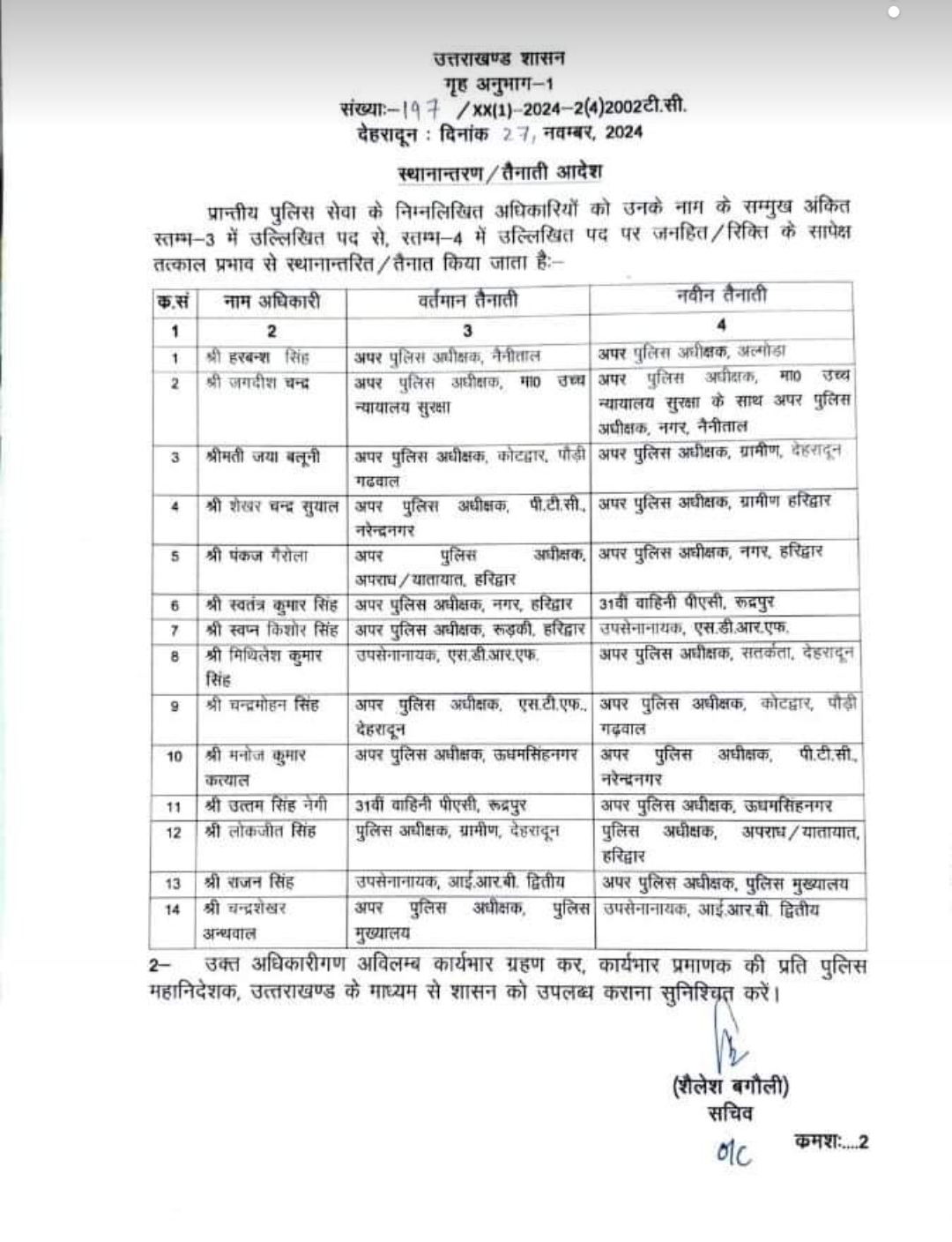 उक्त अधिकारीगण अविलम्ब कार्यभार ग्रहण कर, कार्यभार प्रमाणक की प्रति पुलिस महानिदेशक, उत्तराखण्ड के माध्यम से शासन को उपलब्ध कराना सुनिश्चित करें।