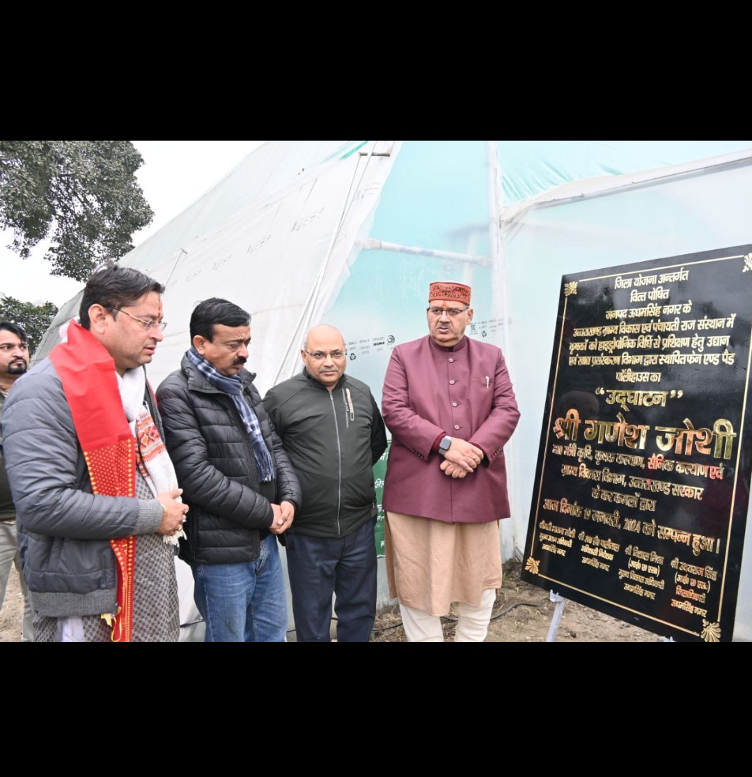 रुद्रपुर, प्रदेश के कृषि एवं जनपद प्रभारी मंत्री गणेश जोशी ने आज जिला योजना अंतर्गत वित्त पोषित जनपद के उत्तराखंड ग्राम्य विकास एवं पंचायती राज संस्थान में कृषकों को हाइड्रोपोनिक विधि से प्रशिक्षण हेतु 08 लाख की लागत से बने उद्यान एवं खाद्य प्रसंस्करण विभाग द्वारा स्थापित फेन एण्ड पैड पॉलीहाउस का उद्धघाटन किया।