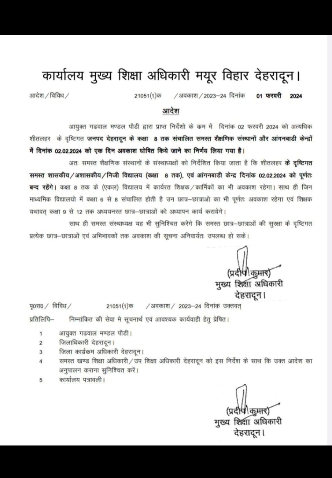 देहरादून के कक्षा 8 तक संचालित समस्त शैक्षणिक संस्थानों और आंगनबाडी केन्द्रों में दिनांक 02.02.2024 को एक दिन के अवकाश की घोषणा
